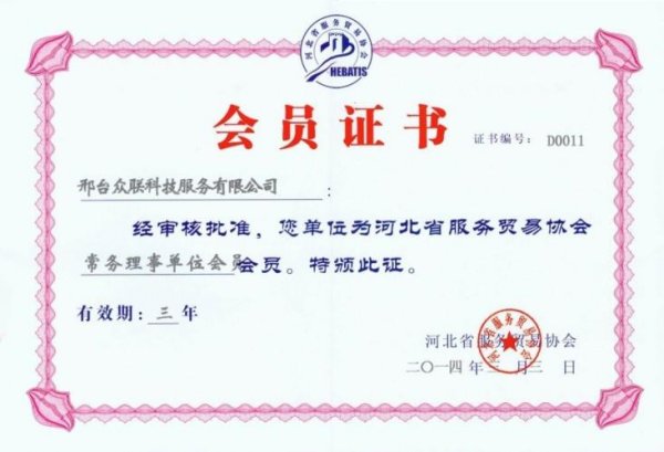 2014年3月 眾聯(lián)科技成為河北省服務(wù)貿(mào)易協(xié)會(huì)常務(wù)理事會(huì)員單位。