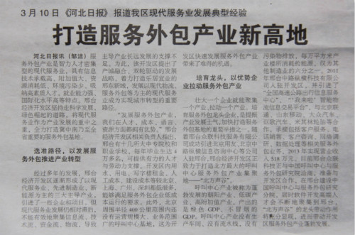 邢臺眾聯(lián)科技服務有限公司作為邢臺市服務外包產(chǎn)業(yè)的龍頭企業(yè),于3月10日分別在《河北日報》第07版中國?國際版面及邢臺《開發(fā)區(qū)報》頭版以“打造服務外包產(chǎn)業(yè)新高地”為題,刊登了眾聯(lián)科技發(fā)展服務外包產(chǎn)業(yè)新聞。文中提到眾聯(lián)科技將充分發(fā)揮服務外包產(chǎn)業(yè)的帶頭作用,積極帶動邢臺經(jīng)濟開發(fā)區(qū)服務外包產(chǎn)業(yè)的蓬勃發(fā)展。
