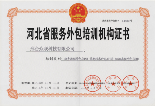 熱烈祝賀我公司獲得由河北省人力資源和社會保障廳、河北省教育廳、河北省商務(wù)廳聯(lián)合授予的《河北省服務(wù)外包培訓(xùn)機構(gòu)證書》,培訓(xùn)的類別涵蓋了業(yè)務(wù)流程外包(BPO)、信息技術(shù)外包(ITO)、知識流程外包(KPO)三項。